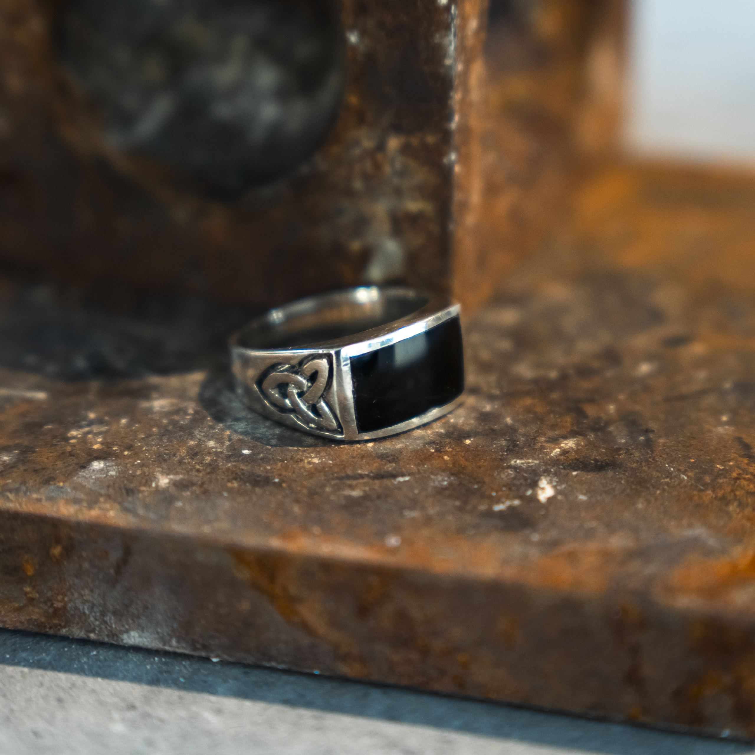 טבעת בעלת מלבן שחור מרכזי ושני צדדים עם חריטת טרייבל ייחודית. עיצוב מודגש וסטייל גברי חזק, מושלם למי שאוהב תכשיט עם אופי ונוכחות.