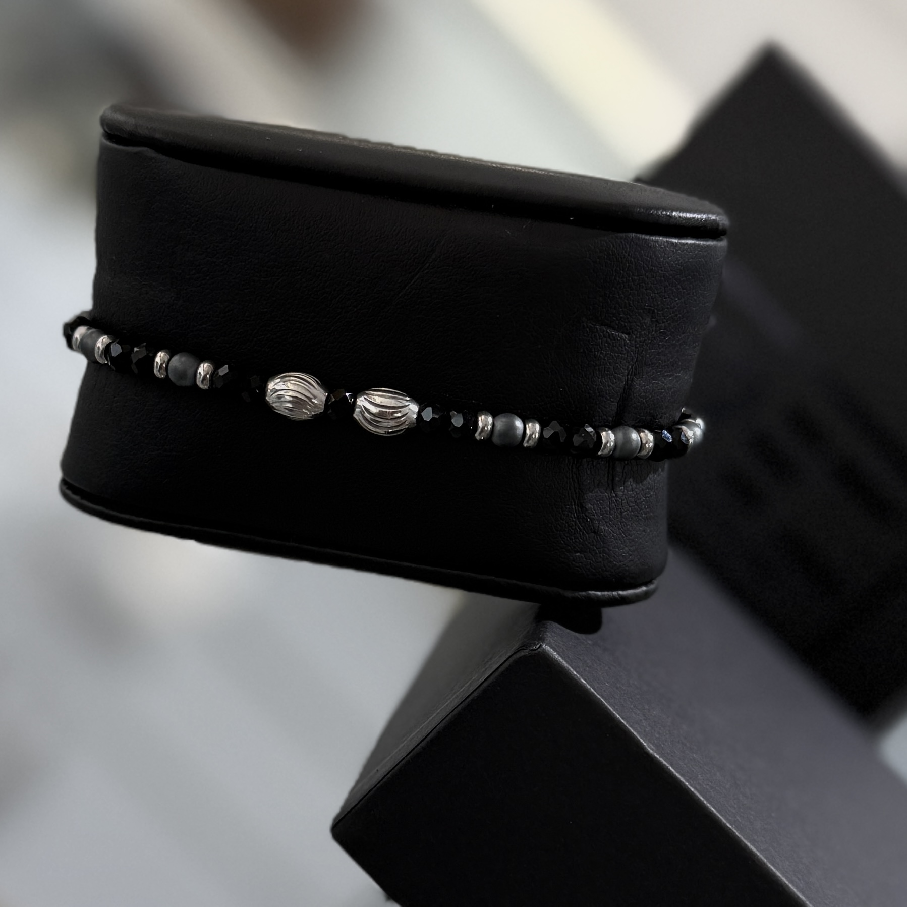 צמיד אבני חן לגבר עוצמה עם שילוב מדויק של המטייט אפור כהה, כסוף ושחור מאט.