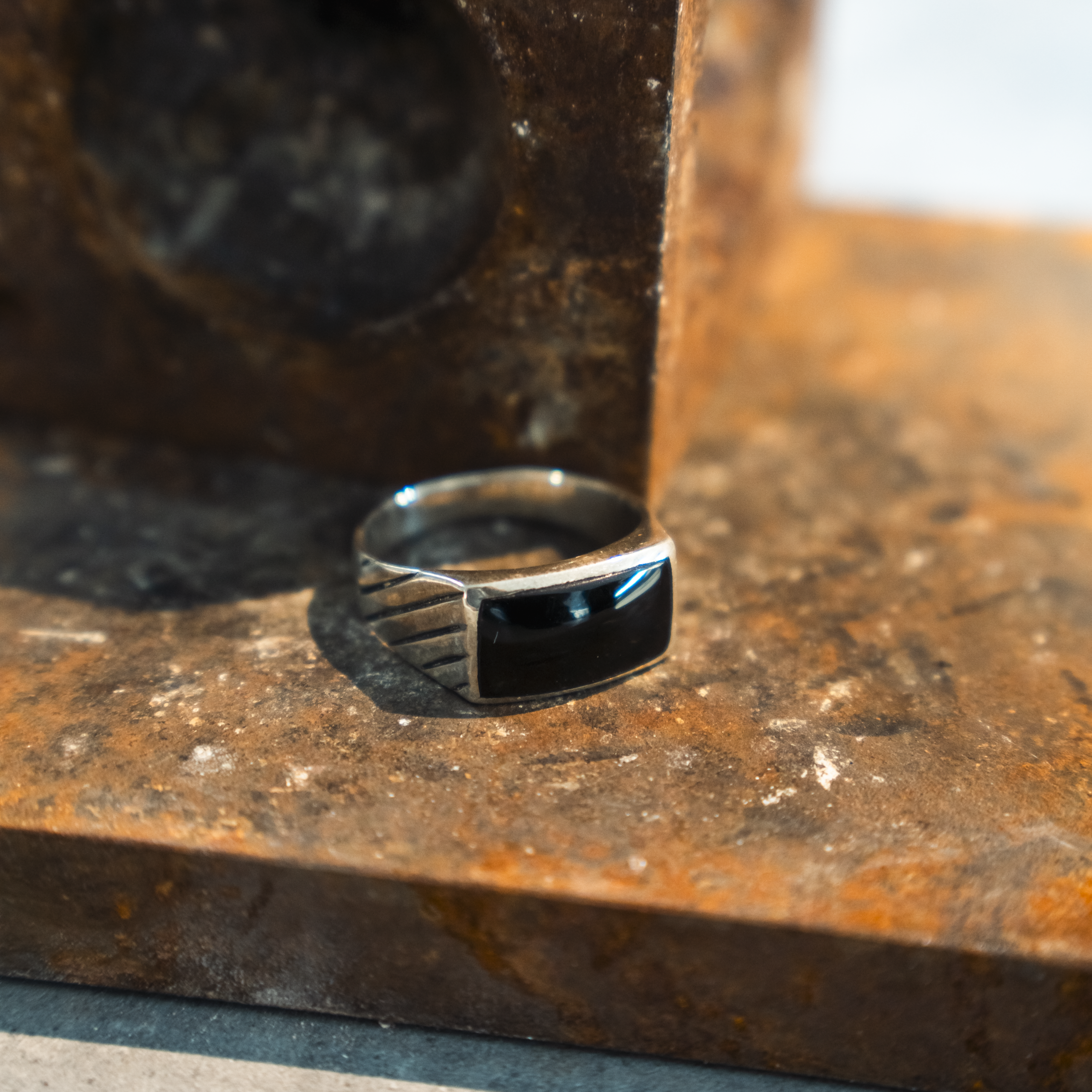 טבעת כסף איכותית בעיצוב מודרני, עם מלבן שחור מרכזי ופסים חרותים בצדדים להשלמת מראה גברי ואלגנטי.
