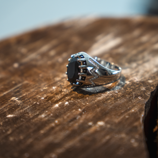 טבעת אלגנטית בעיצוב נקי, עם אבן שחורה אובלית במרכז ושיבוץ זירקונים עדין בצדדים להוספת ברק מעודן. שילוב מושלם של עוצמה ואלגנטיות, מתאימה לשימוש יומיומי ולכל לוק גברי.