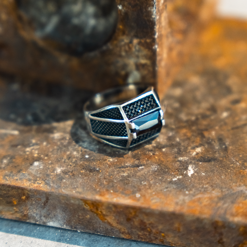 טבעת מרשימה לגבר, עם אבן מרכזית מלבנית ושיבוץ עדין של אבני זירקון שחורות בצדדים. עיצוב נקי ואלגנטי שמוסיף נוכחות וסטייל לכל הופעה.